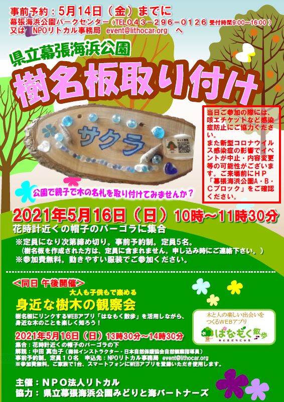 | 申込方法 | 5月14日(金)までにパークセンター(043-296-0126)または NPO法人リトカル事務局 event@lithocar.org へお申込みください(9:00~16:00) ※定員:5名まで 定員になり次第締め切りさせていただきます。 |