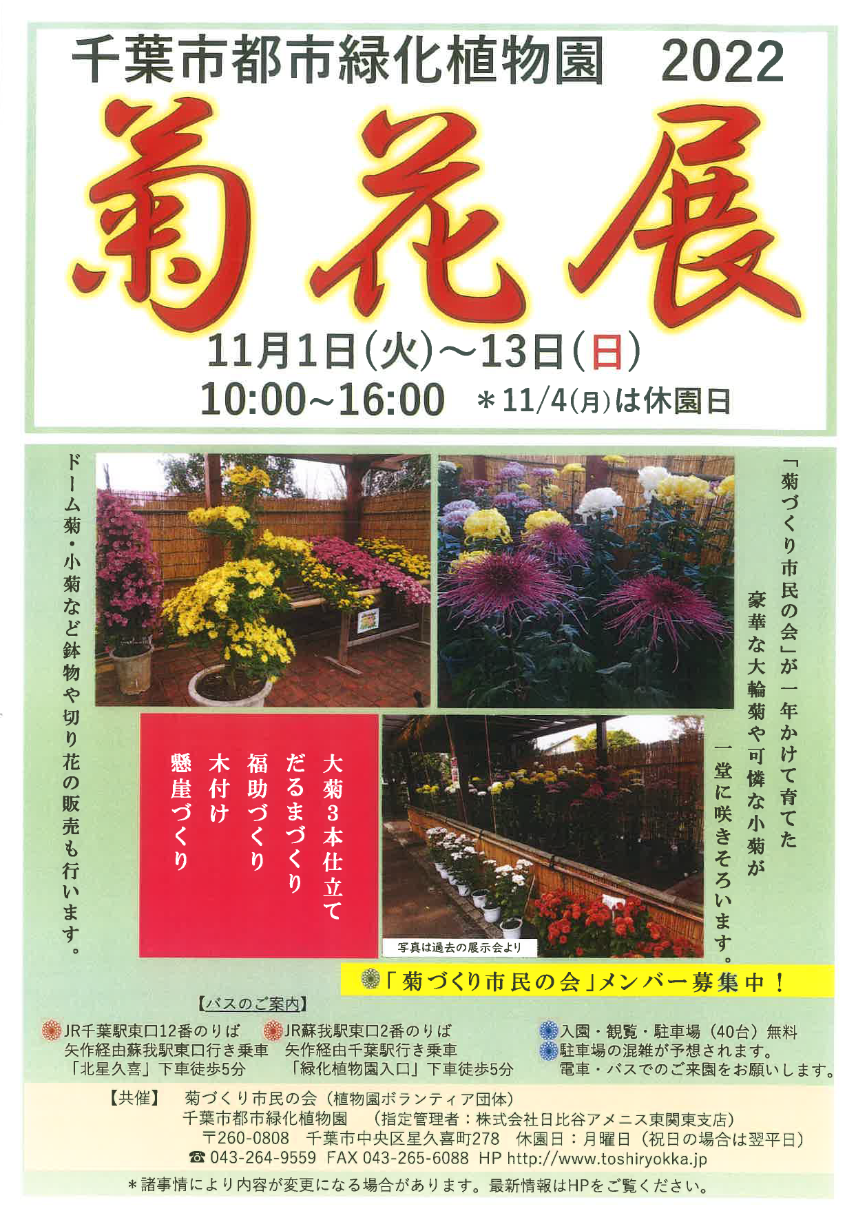 | 主催者 | 共催:菊づくり市民の会(植物園ボランティア団体)千葉市都市緑化植物園 |