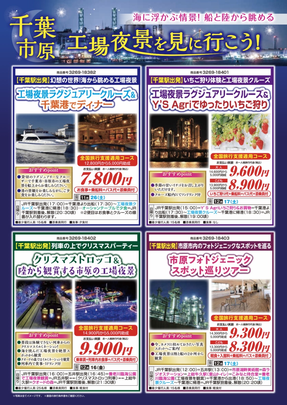 JR千葉駅発→Y’S Agriでいちご狩りとお買い物→千葉港から工場夜景クルーズ→JR千葉駅着