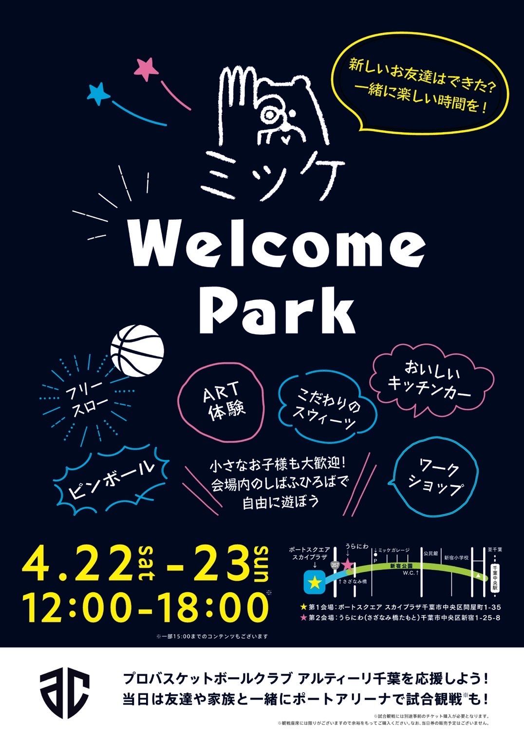 | 備考 | 【お客様へのお願い】 ●体調のすぐれない方はご来場をお控えください。 ●感染症対策は行政のガイドラインに沿って行います。参加者の皆様にもガイドライン遵守のご協力をお願いいたします。 ●記録・取材のためにイベントの様子を写真並びに動画にて撮影をおこないます。その際に会場内のお客様が映り込む場合がありますことをご了承ください。また、肖像権等に十分配慮を行ったうえで、撮影した内容はプロモーション等に活用する場合がございます。併せてご了承お願い申し上げます。 ●当会場は多くの方が利用する施設です。安全管理には十分に努めますが、会場内外で発生した事故・けが等は、主催者・出店者の著しい過失を除き一切責任を負いません。 ●雨天時はポートタウン内アトリウム会場にて縮小開催となりますが、災害の危険性 や感染症予防の観点から中止にする場合がございます。詳細はInstagram(@mikke_urachiba)をご確認ください ●イベントの内容につきまして予告なく変更する場合がございます。 |
