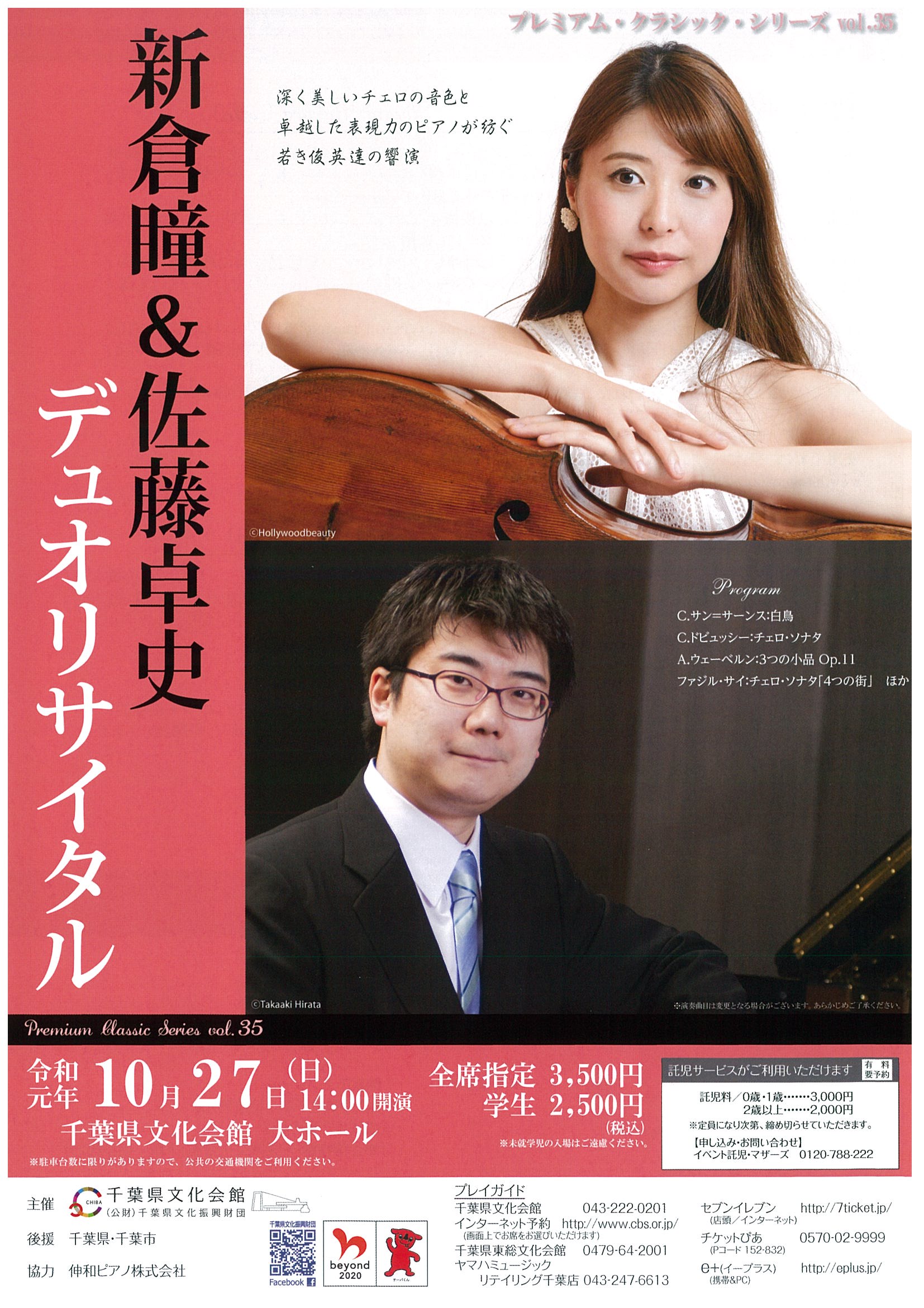 | 申込方法 | <チケット販売・お問合せ> ・インターネット予約 http://www.cbs.or.jp/ ・千葉県文化会館 TEL:043-222-0201 ・千葉県東総文化会館 TEL:0479-64-2001 ・チケットぴあ TEL:0570-02-9999 ・e+(イープラス)http://eplus.jp/ ・セブンイレブン(店頭・インターネット)http://7ticket.jp/ ・ヤマハミュージックリテイリング千葉店TEL:043-247-6613 |