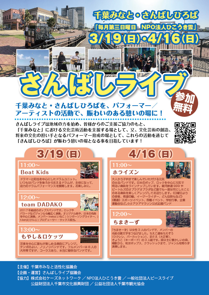 ・さんばしライブは、地域の方を始め皆様からのご支援とご協力のもと「千葉みなと」における文化芸術活動を支援する場として、また、文化芸術の創造、将来の文化の担い手となるパフォーマー育成の場として、これらの活動を通じて「さんばしひろば」が賑わう憩いの場となる事を目指しています!