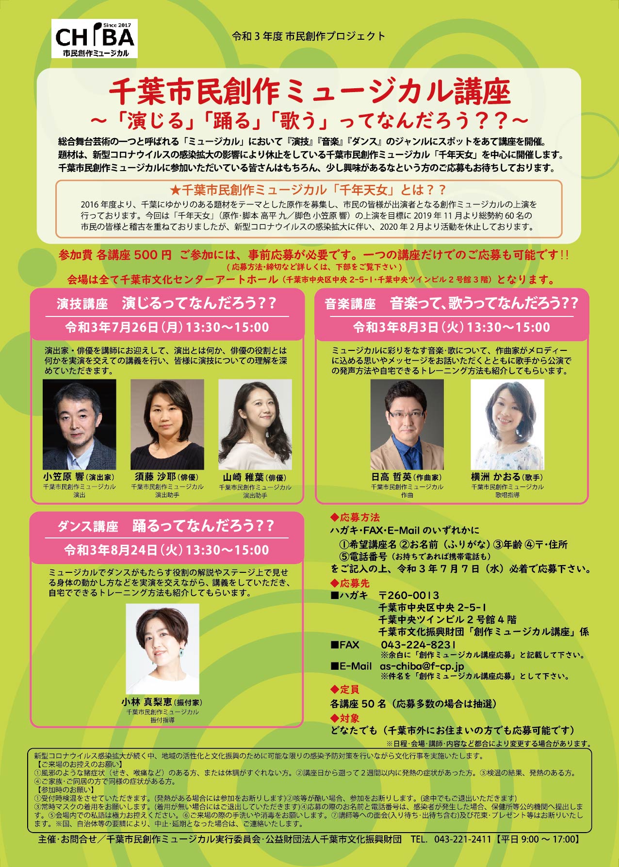 | 申込方法 | ハガキ・FAX・Eメールに ①希望講座名 ②お名前(ふりがな) ③年齢 ④〒・住所 ⑤電話番号(お持ちであれば携帯も) をご記載いただき、2021年7月7日(水曜)必着でお送り下さい。 〒260-0013 千葉市中央区中央2-5-1 千葉市文化振興財団 「創作ミュージカル講座」係 FAXの場合 043(224)8231 ※余白に「創作ミュージカル講座応募」と記載して下さい。 Eメールの場合 as-chiba@f-cp.jp ※件名を「創作ミュージカル講座応募」として下さい。 |