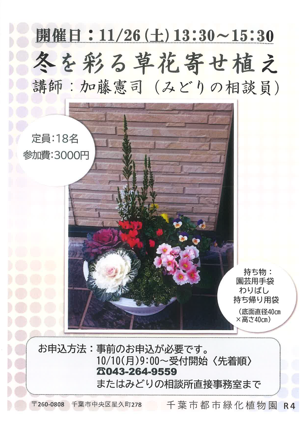 冬を彩る草花寄せ植え@千葉市都市緑化植物園<11/26(土曜)>