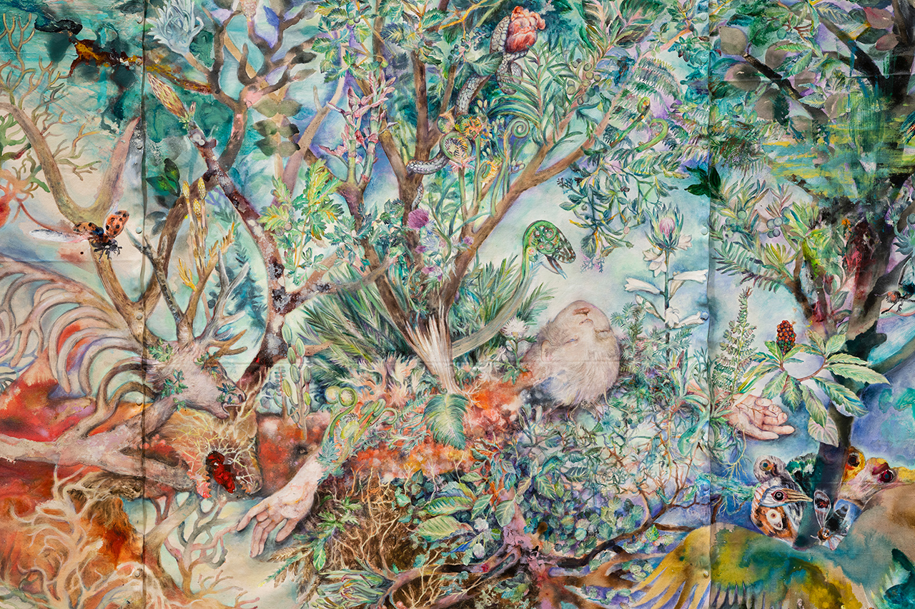今回は、美術家の大小島真木さんをお迎えします。大小島さんはこれまで、描くことを通じて、生き物を包み込む森や繁殖する菌、国境をまたぐ鳥、覚醒する猿など、様々な生物のまなざしを自らの内に宿し、万物の記憶の集合体としての世界のありようを追求してきました。「人間以外の目線で世界を語る」というテーマのもと、会期中に繰り広げられる「ゲスト」たちとのトークや、来館者たちとの往復書簡を糧に、アーティストがどのような空間を作り、変化させていくのか、目が離せなさそうです。