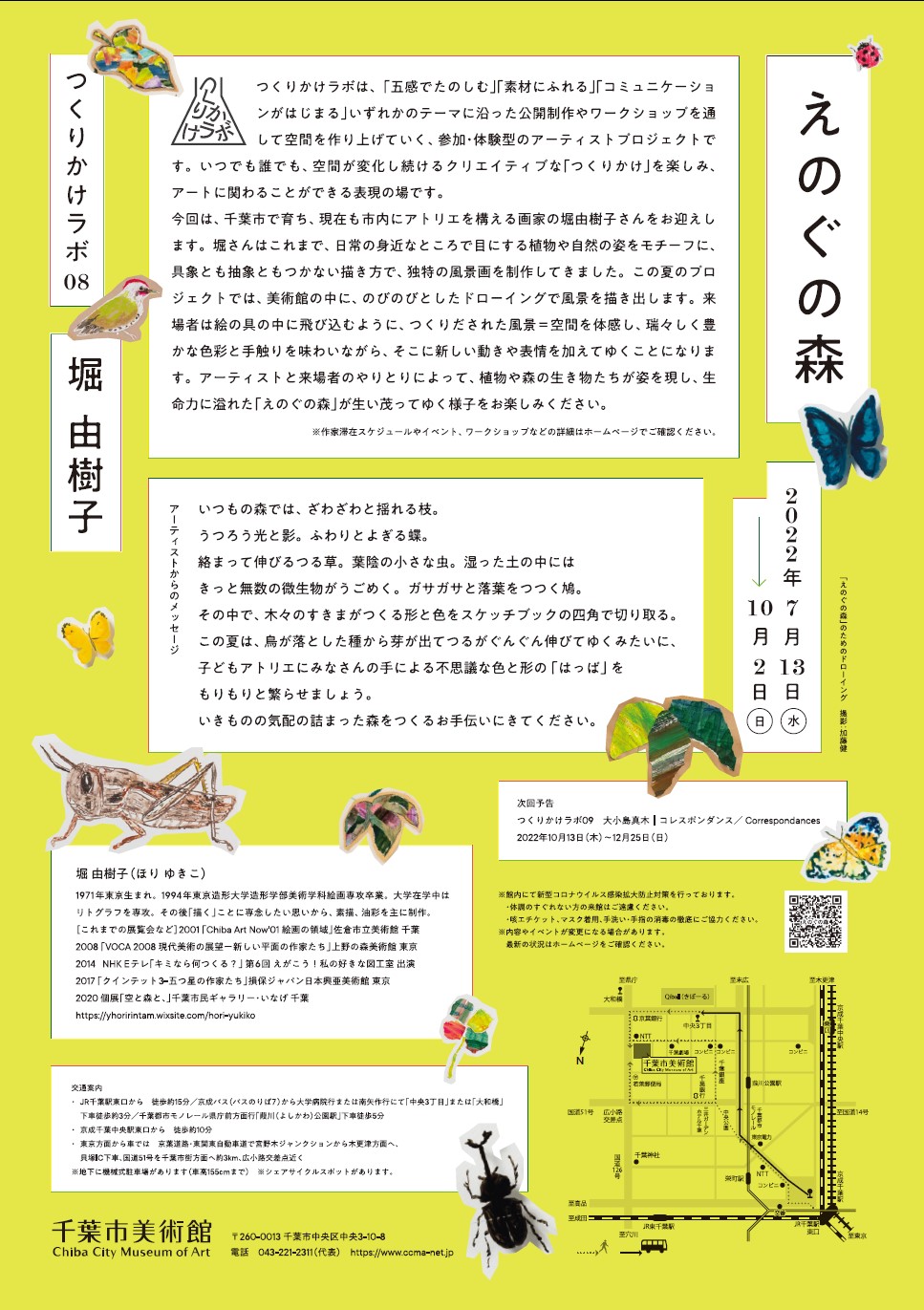 今回は、千葉市で育ち、現在も市内にアトリエを構える画家の堀由樹子さんをお迎えします。堀さんはこれまで、日常の身近なところで目にする植物や自然の姿をモチーフに、具象とも抽象ともつかない描き方で、独特の風景画を制作してきました。この夏のプロジェクトでは、美術館の中に、のびのびとしたドローイングで風景を描き出します。来場者は絵の具の中に飛び込むように、つくりだされた風景=空間を体感し、画材の瑞々しく豊かな色彩と手触りを味わいながら、そこに新しい動きや表情を加えてゆくことになります。アーティストと来場者のやりとりによって、植物や森の生き物たちが姿を現し、生命力に溢れた「えのぐの森」が生い茂ってゆく様子をお楽しみください。