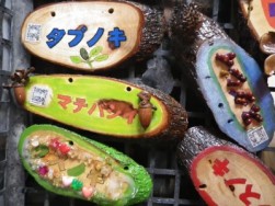 公園の間伐材で作った板に 木の名前を書き、絵の具、木の実、ビーズなどで装飾します。