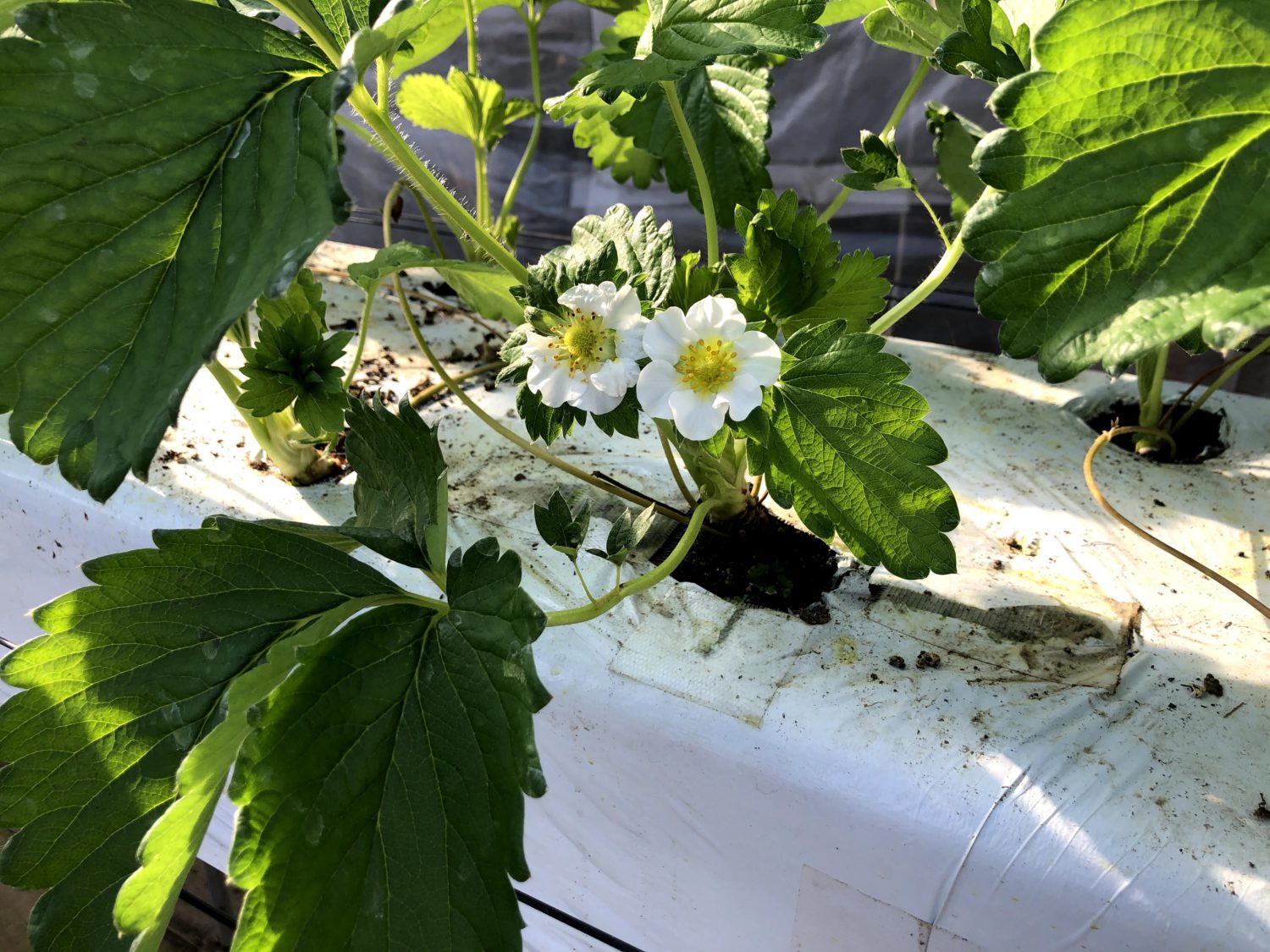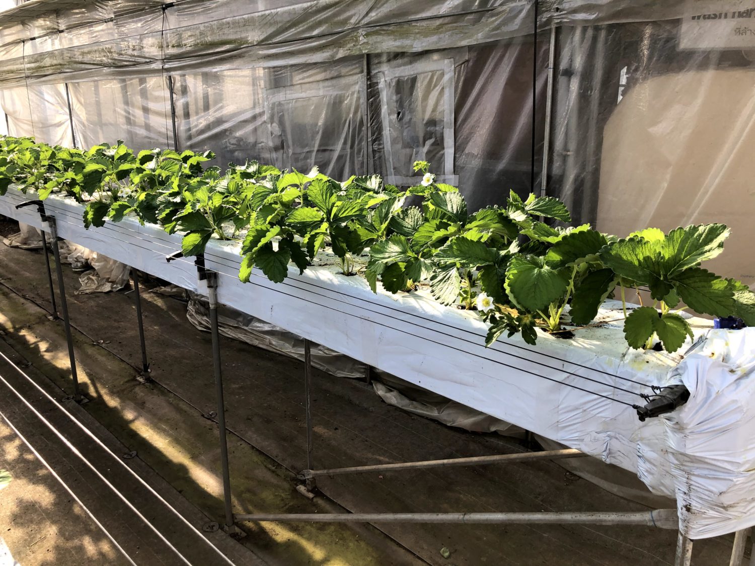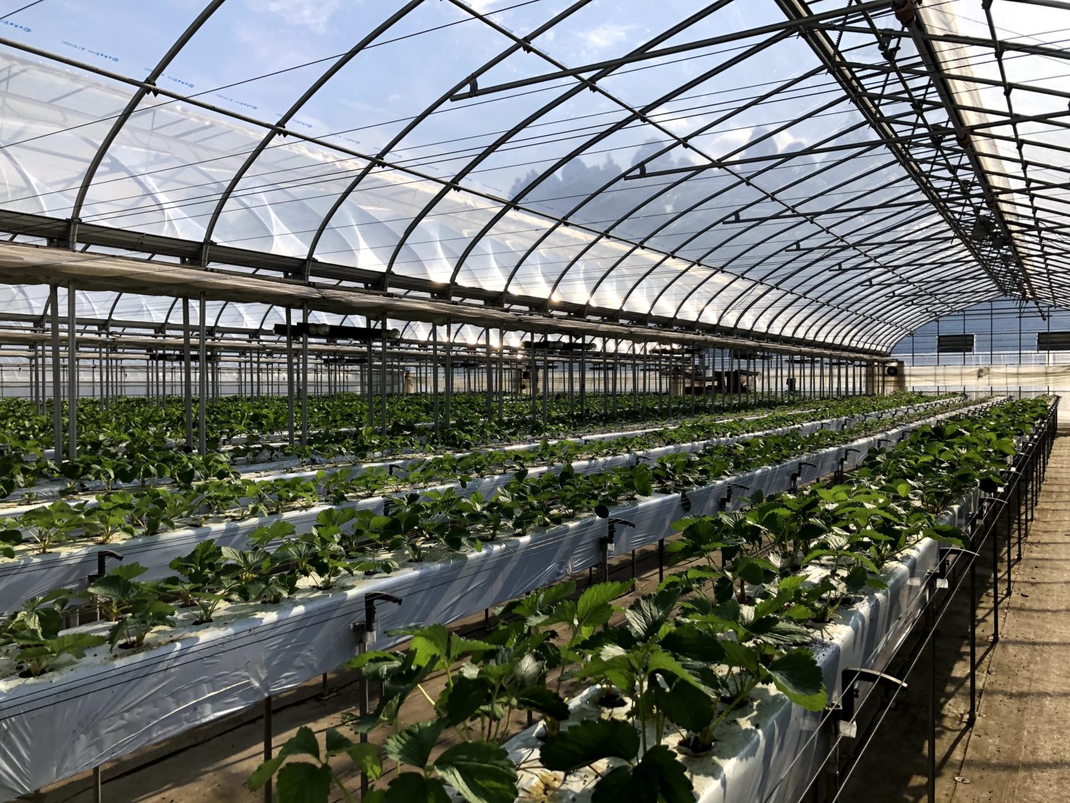 ドラゴンファームさんは収穫がしやすい高設栽培です(黒い三本の棒は茎が伸びたときの折れ防止策だそうです!)