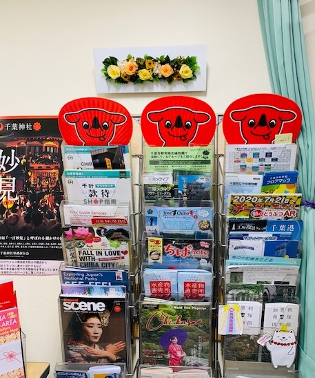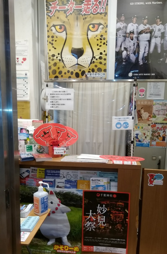 △幕張観光情報センターのカウンターにて、チーバくんうちわをお渡ししております。