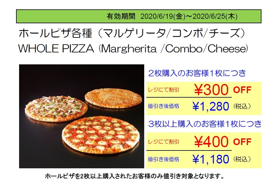 ・ホールピザ各種2枚購入の会員様、1枚につき300円OFF