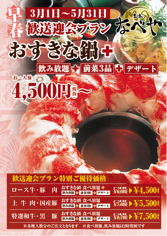 幹事様必見!春の歓送迎会は食べ放題・飲み放題のなべやで!