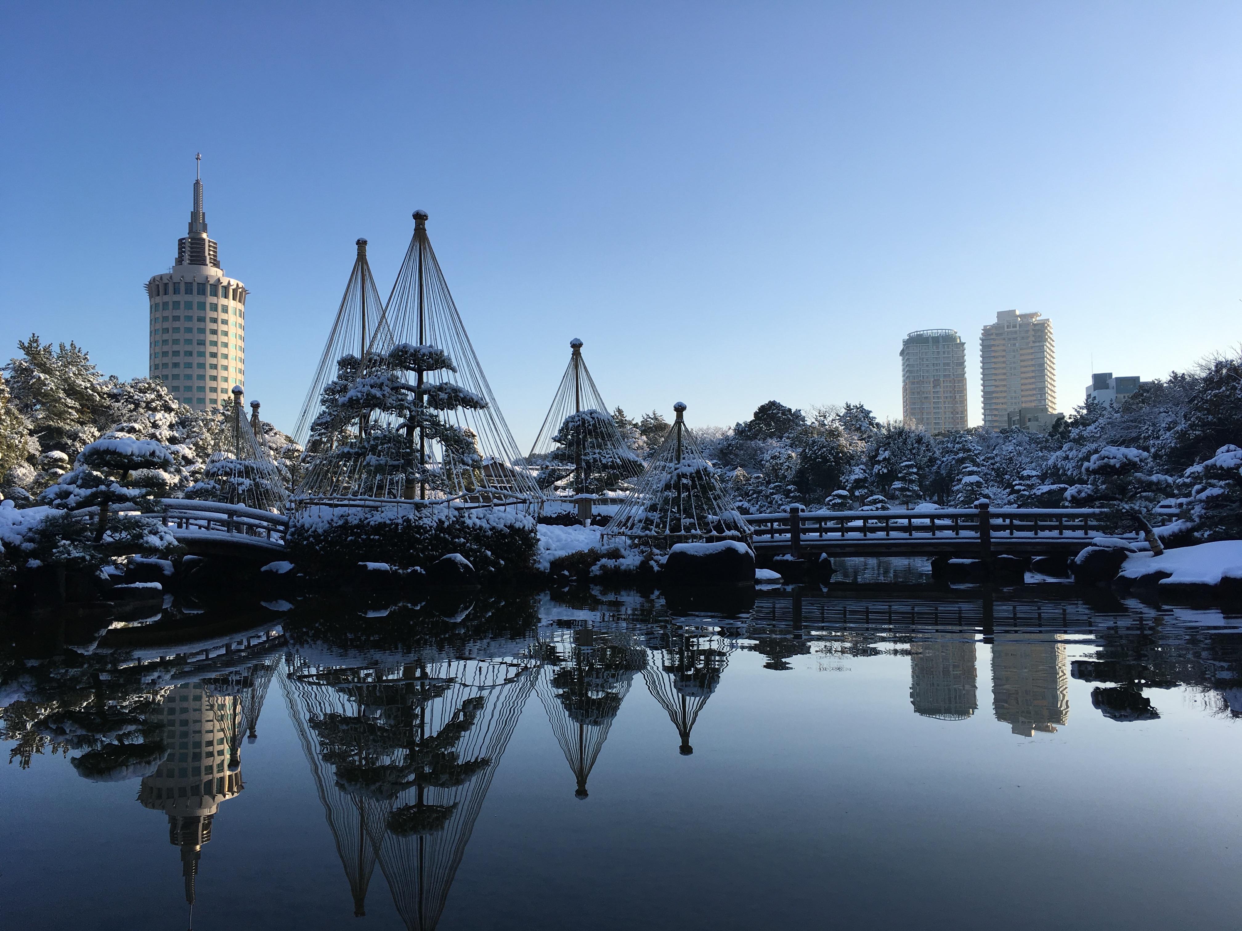 積雪の多い東北地方や北陸地方などで見られる「雪吊り(ゆきつり)」。雪が枝葉に付着し枝が折れてしまうことを防ぐために荒縄で枝を保持する造園技術で、幹付近に柱を立て、傘にはワラボッチをかぶせ、松の周囲に円状に縄を張り作成します。幕張海浜公園(見浜園)では美観目的に冬の風物詩としての雪吊り作成を毎年実施しています。この季節にしか見ることのできない見浜園の風景をぜひご覧ください。 2月末までご覧いただけます。