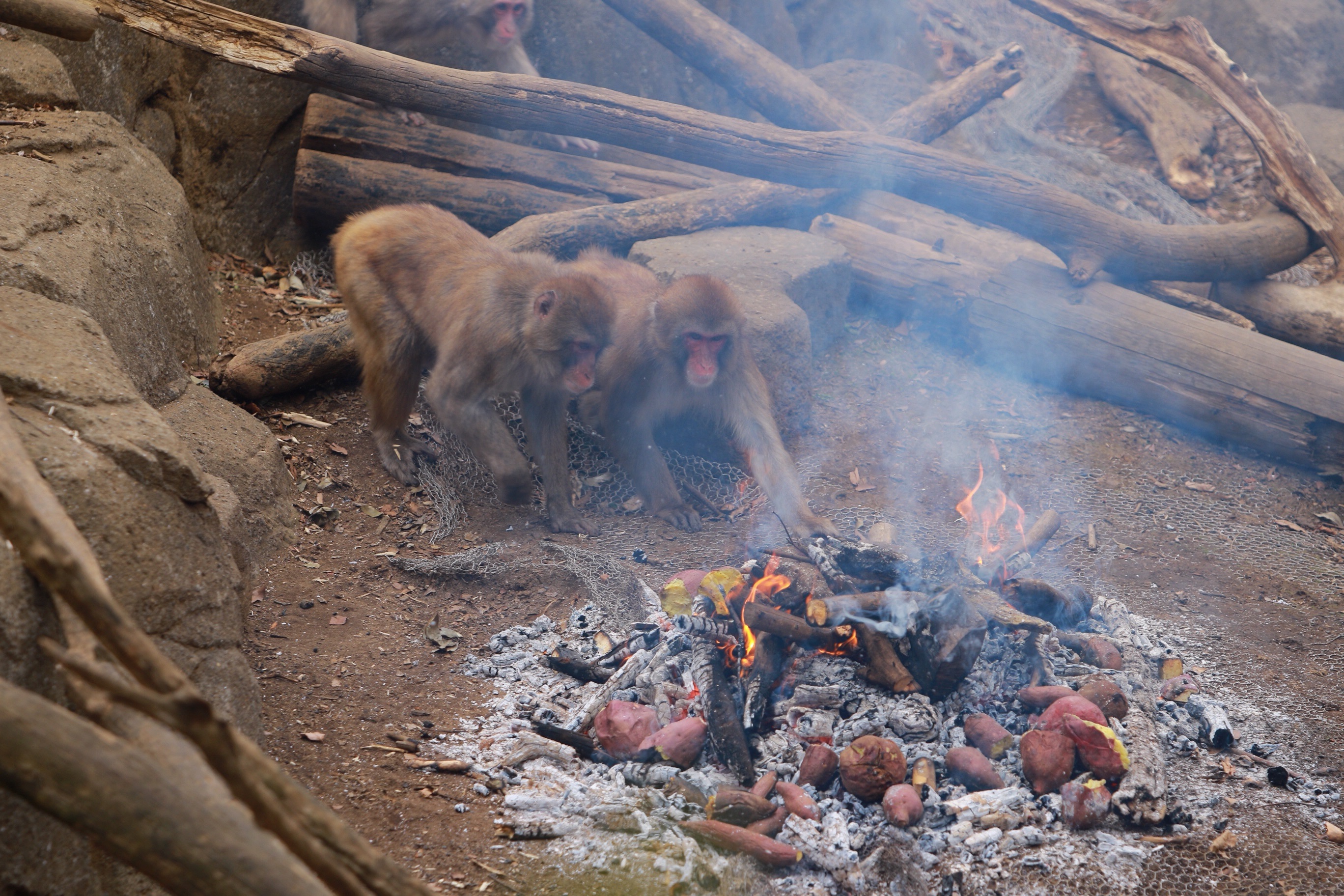 飼育担当者の解説を聞きながら、サルたちがたき火を見てどのような反応を示すのか、また、アツアツの焼き芋をどのようにして食べるのかなどをご覧ください。