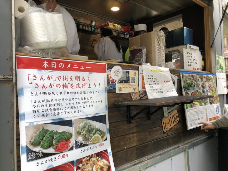 フード:①さんが焼き ②さんが天 ③さんが汁 [各300円] ④さんが丼 [600円]
