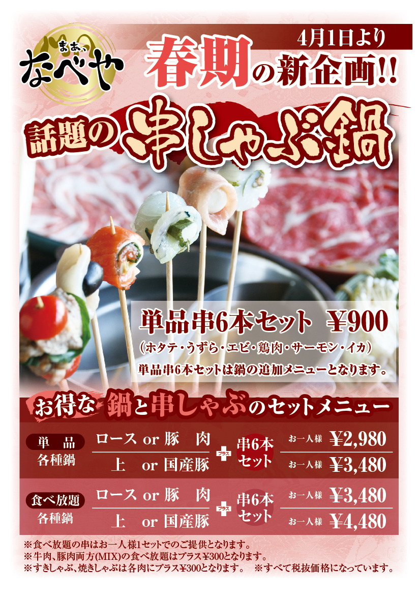GW中、全て営業/「今、話題の串しゃぶなべをご用意しております!17時からのご予約ですと30%OFFにてお鍋料理ご優待しております。皆様でぜひご利用ください。」