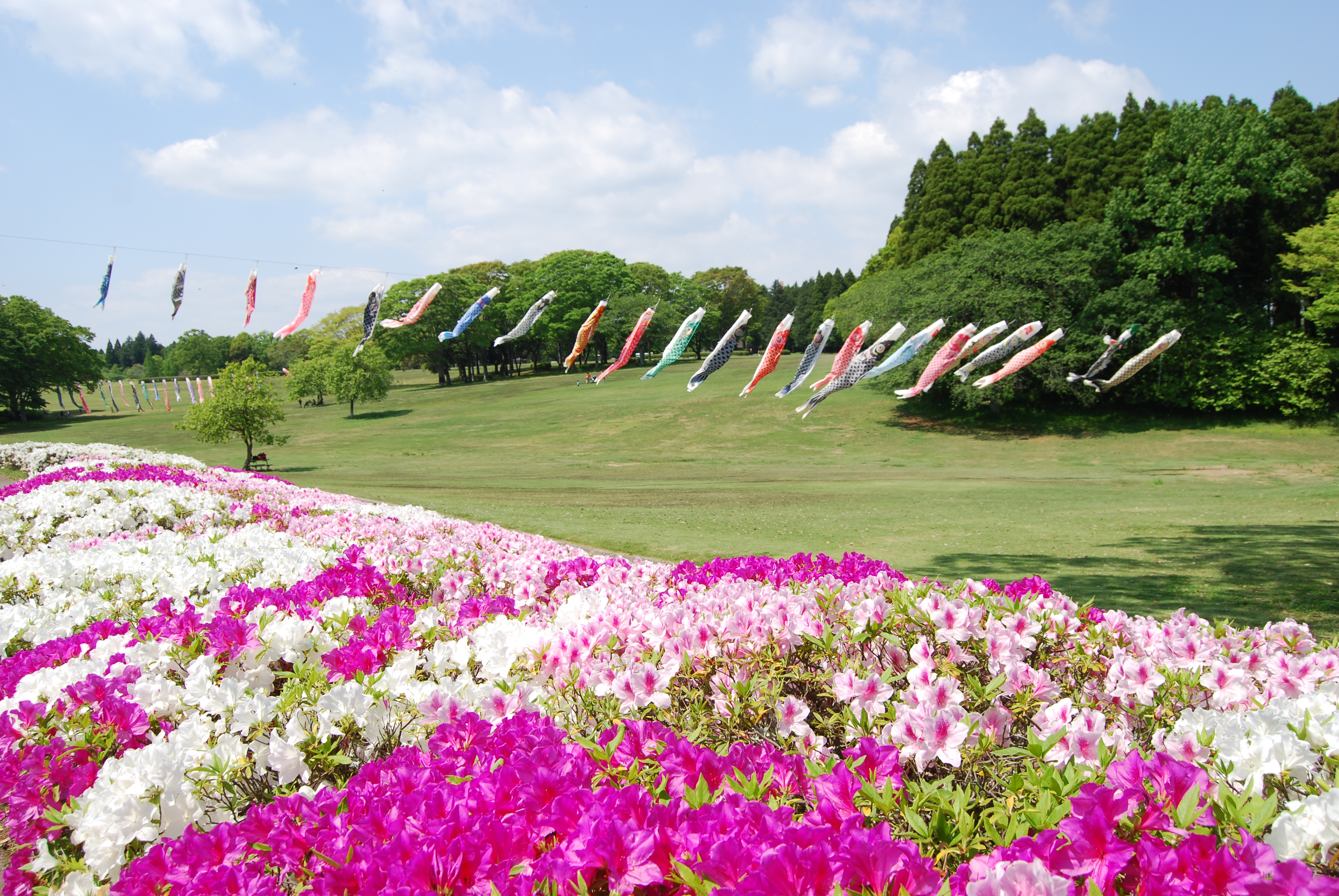 GW中、全て開園/「噴水池の上空ではこいのぼりが20匹泳いでいます。ぜひともご来園ください。」