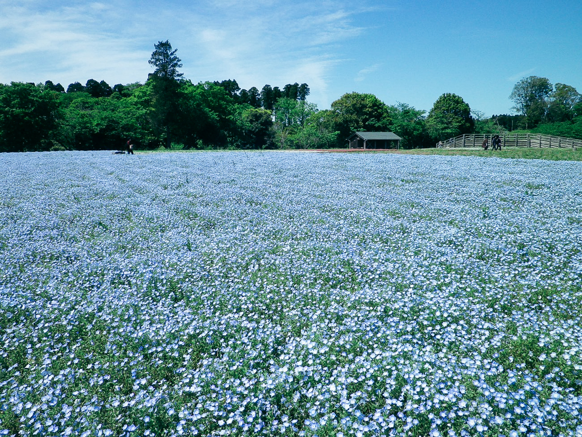 シバザクラが咲く頃には、ネモフィラも一斉に開花します。晴れた日は、青空とネモフィラブルーが一緒に写った、まるで絵画のような一枚を撮影することもできますよ。
