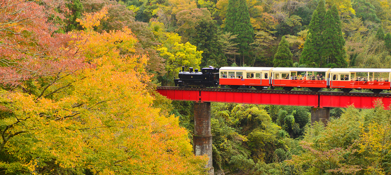 小湊鉄道の車窓から渓谷を眺めながら、赤や黄色、緑のコントラストを堪能しましょう。