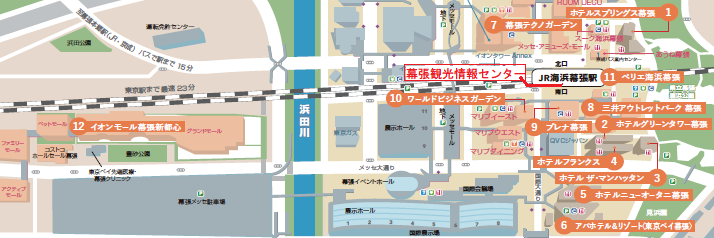 ホテルスプリングス幕張、ホテルグリーンタワー幕張、アパホテル&リゾート〈東京ベイ幕張〉、幕張テクノガーデン、三井アウトレットパーク幕張、プレナ幕張、イオンモール幕張新都心、幕張メッセ 計8施設