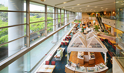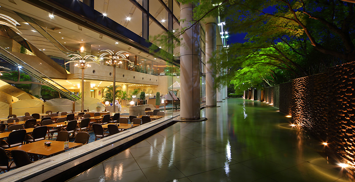 水の流れる景色と開放感のある高い天井は、ゆったりとしたリゾート空間を演出。日本の四季に合わせて世界各国の料理をアレンジ。旬の食材を取り入れた、幅広い世代のお客様にお愉しみ頂けるレストランです。