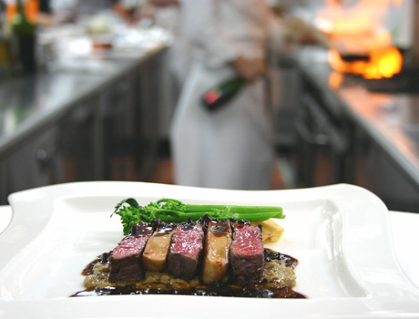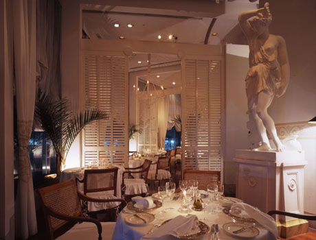 高い天井にゆるやかなカーブを描く窓、白を基調とした店内は、コロニアル・リゾートを思わせる開放感にあふれています。海外から取り寄せたオブジェとともに、洗練された西洋料理をお楽しみください。