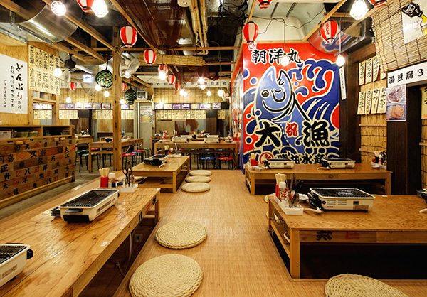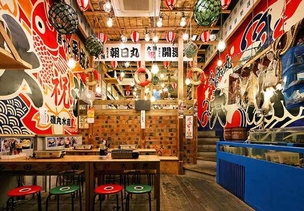 駅からすぐ!魚市場のような入り口が目印。「海の家」に来たようなプチ旅気分を味わえるお店です。コンロで、新鮮な魚介を焼いて食べるバーベキュー感覚で楽しめます。本記事持参でファーストドリンク1杯無料。