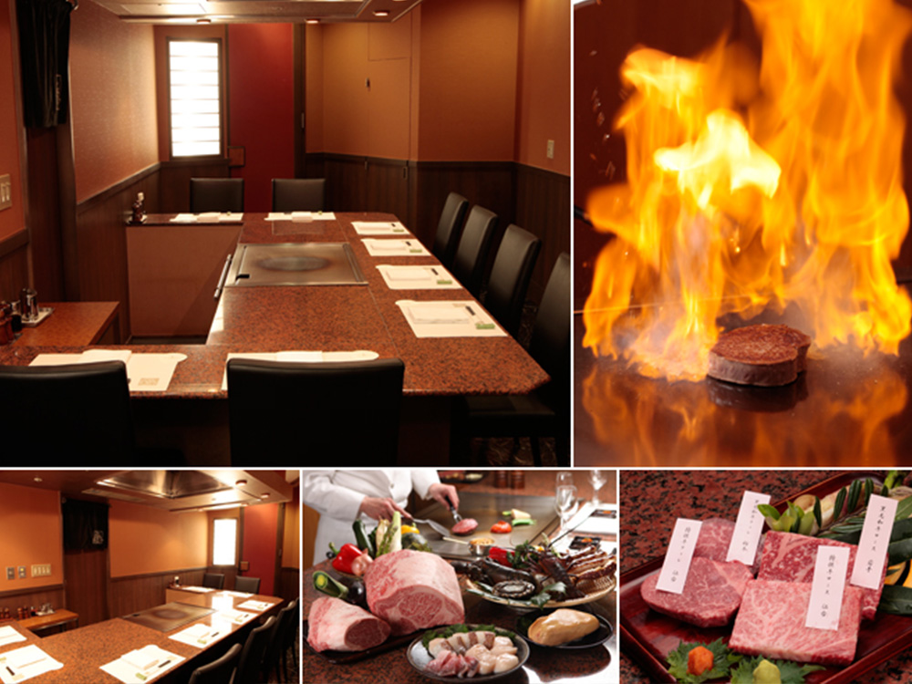銘柄牛や伊勢海老などの厳選した食材を、お客様の目の前で焼き上げます。ランチからディナーまでコースも多彩。落ち着いた雰囲気の個室もご用意しています。
