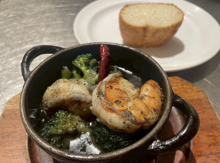千葉県産の醤油を使用。にんにく、えび、ブロッコリーとの相性が◎!バケットと召し上がって頂きます。