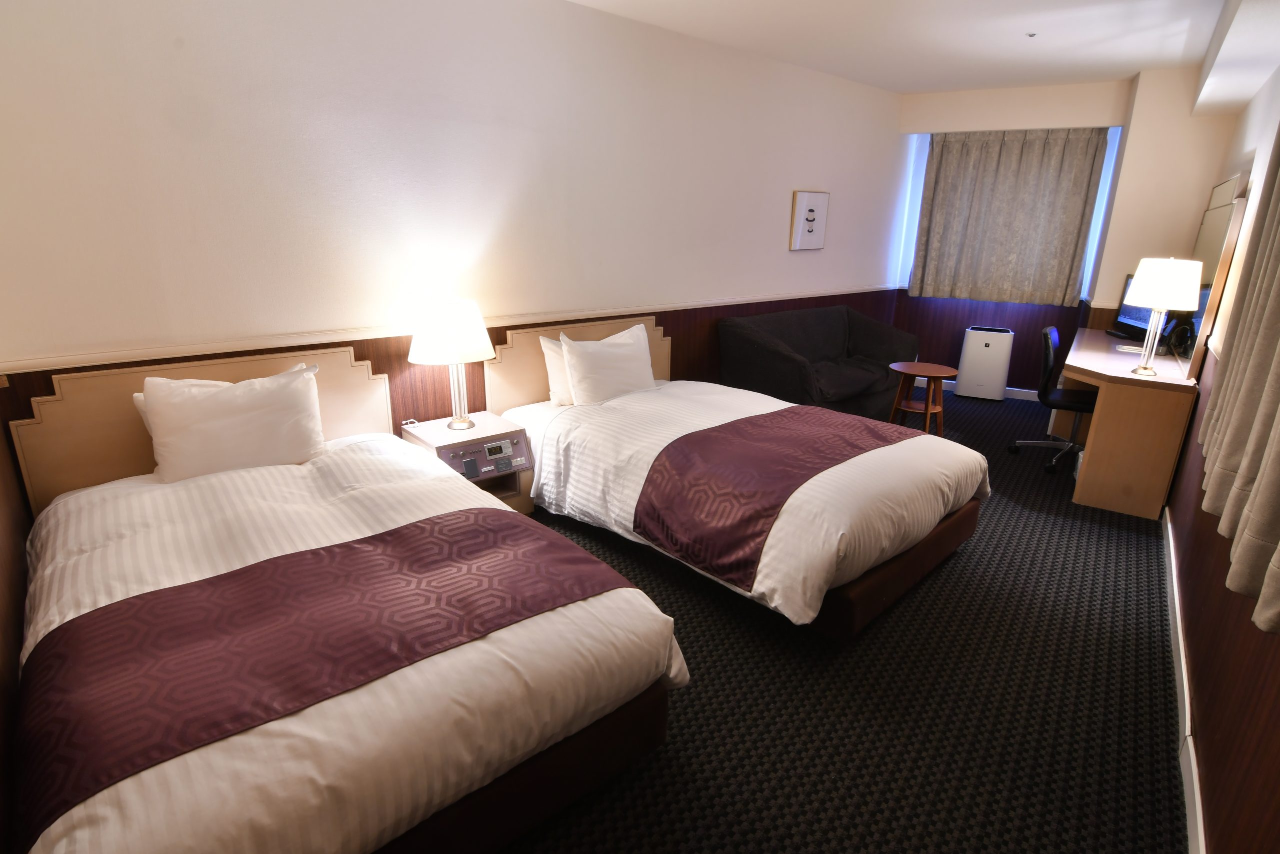 客室にはシモンズベッドを導入、空気清浄機、扇風機を完備。レディースルーム・アジョイニングルーム等ご希望にあった客室を提供いたします。