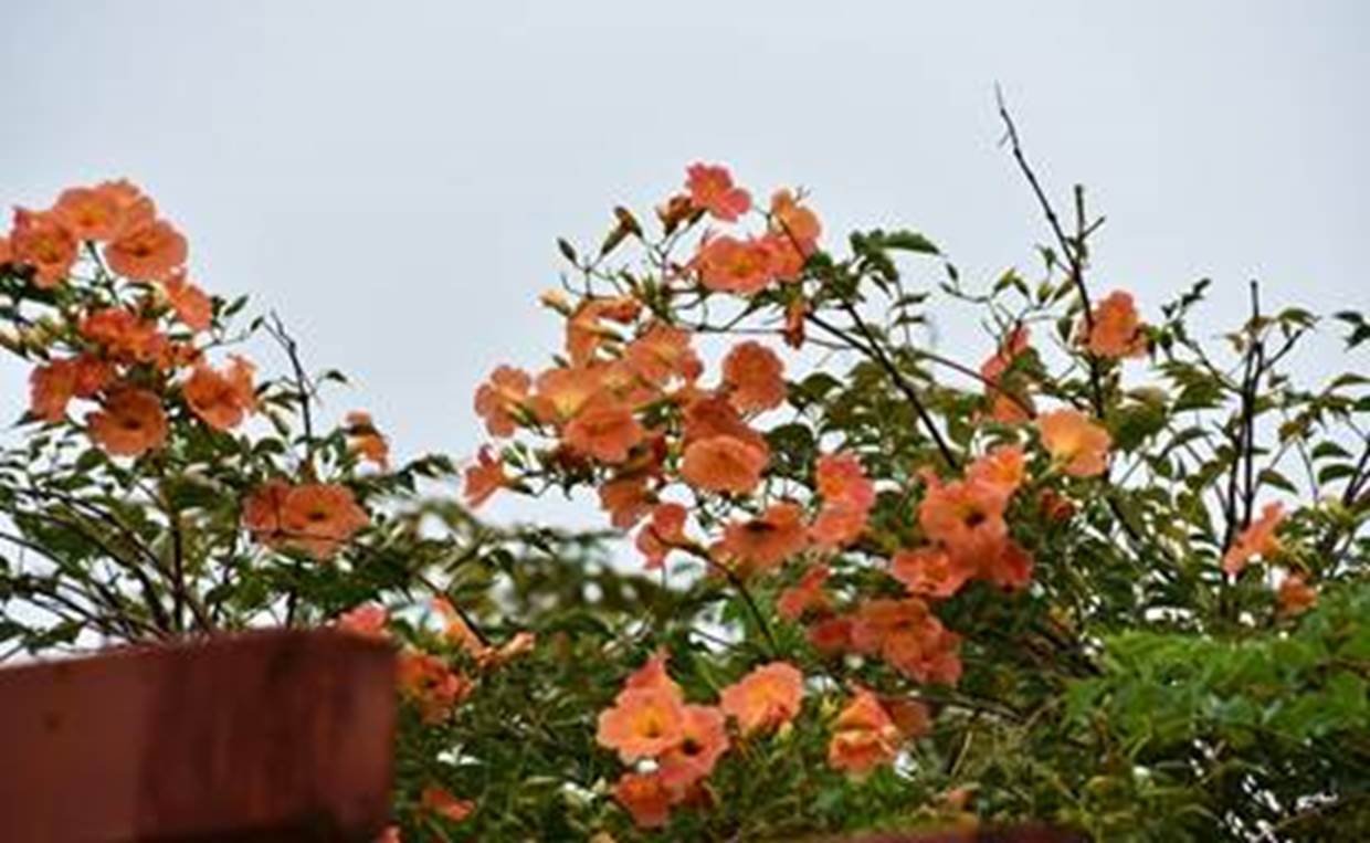 赤橙色の5弁花で咲く花、「ノウゼンカズラ(ノウゼンカズラ科)」の綺麗な花模様。